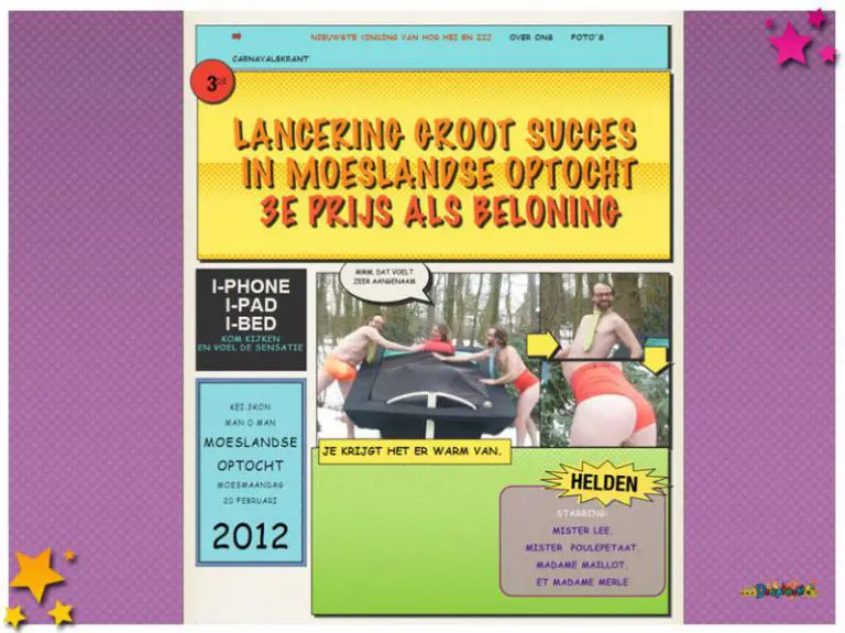 Waarschijnlijk staat deze site al een tijdje op het internet, maar ik kwam hem toevallig tegen en wil hem toch graag met jullie delen. Hôg Hei & Zij doen al jaren mee aan de optocht van Schaijk en niet zonder succes. Mooie creaties waarbij het publiek volop in wordt meegetrokken. Afgelopen jaar deden ze mee met hun creatie de Aai-bed. Daarmee werden ze derde bij de kleine loopgroepen.