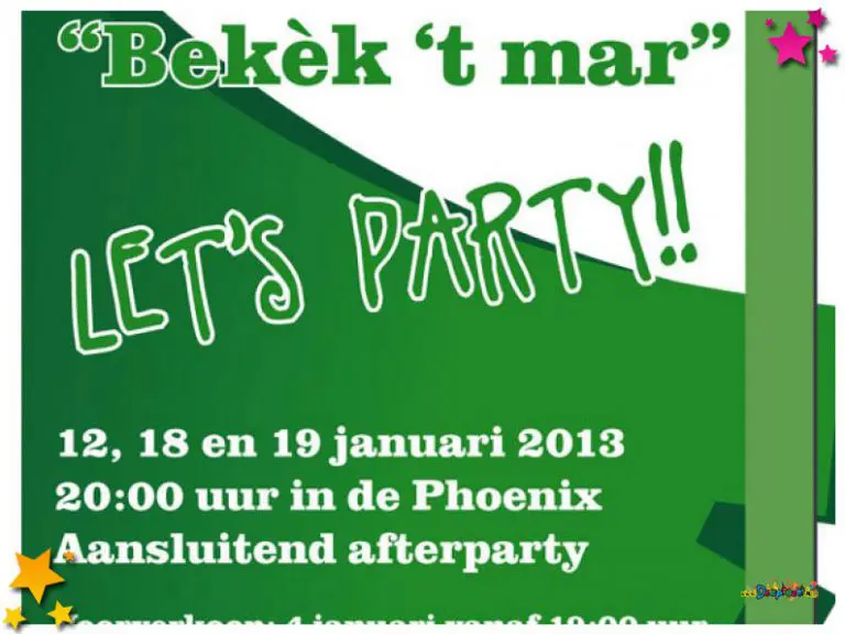 Ben je niet naar de kaartverkoop van afgelopen vrijdag geweest en wil je toch graag naar “Bekèk ’t Mar, Let’s Party” haast je dan naar De Phoenix of Bruna in Schaijk. Hier zijn de resterende kaarten voor zaterdag 12 januari en vrijdag 18 januari te koop voor 11 euro.