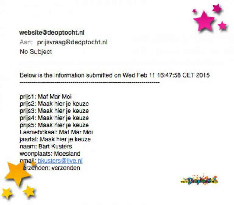 De inzendingen voor de prijsvraag komen binnen. Allemaal netjes ingevuld en veel met verschillende winnaars. Op één na, een mailtje van Bart Kusters. Die is erg zeker van zijn zaak. Op de 1e plaats staat, hoe kan het ook anders, zijn club Maf Mar Moi. De plaatsen 2 t/m 5 mag je zelf invullen en de Lasniebokaal wordt ook gewonnen door Maf Mar Moi. Steuke 2.0 heet dat!