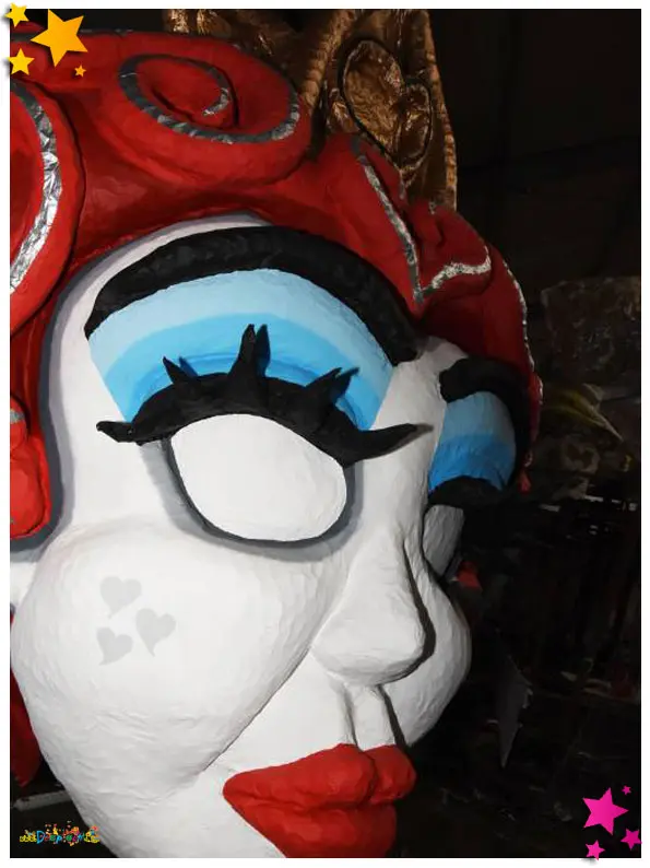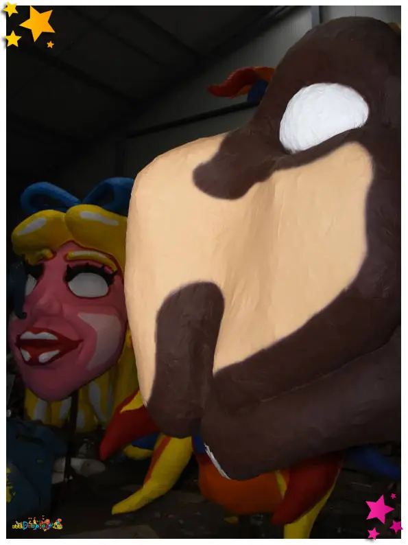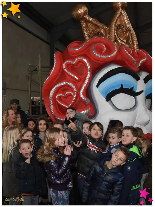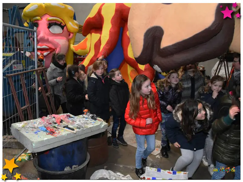 Een kijkje in de bouwschuur van De Wulpse Hertjes leert dat de club ongetwijfeld weer een van de topfavorieten is voor de eerste prijs in de Moeslandse optocht. De ene ‘kop’ is nog mooiere dan de andere en de kinderen van basisschool De Sprankel uit Grave kijken dan ook hun ogen uit. Samen met hun juf, Wulps Hertje Sharon Ariëns, hebben de kids een hele lijst met vragen voorbereid voor de Moeslandse bouwers: ‘Hoe lang zijn jullie aan het bouwen?’ (drie maanden, red.), ‘Kunnen de koppen bewegen?’, ‘Spoelt de verf er niet af als het regent?’ en ‘Hoe krijgen jullie de ogen zo mooi?’. Djarek, Teun en Wouter hebben overal een antwoord op en geven de kinderen ook nog wat handige bouwtips mee. “Die komen goed van pas”, vertelt juf Sharon, “want de kinderen zijn deze week in de klas zelf ook bezig met het bouwen van kleine carnavalswagens. Ze vonden dat al heel leuk om te doen, maar na dit bezoek aan de bouwschuur worden ze ongetwijfeld nóg enthousiaster.”
