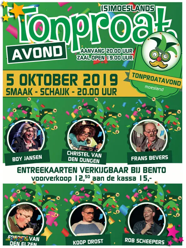 Ga dan snel kaartjes halen voor (s)Moeslands Tonproatavond op 5 oktober bij Smaak in Schaijk. De kaarten zijn verkrijgbaar bij Bento aan de Runstraat 8 te Schaijk.