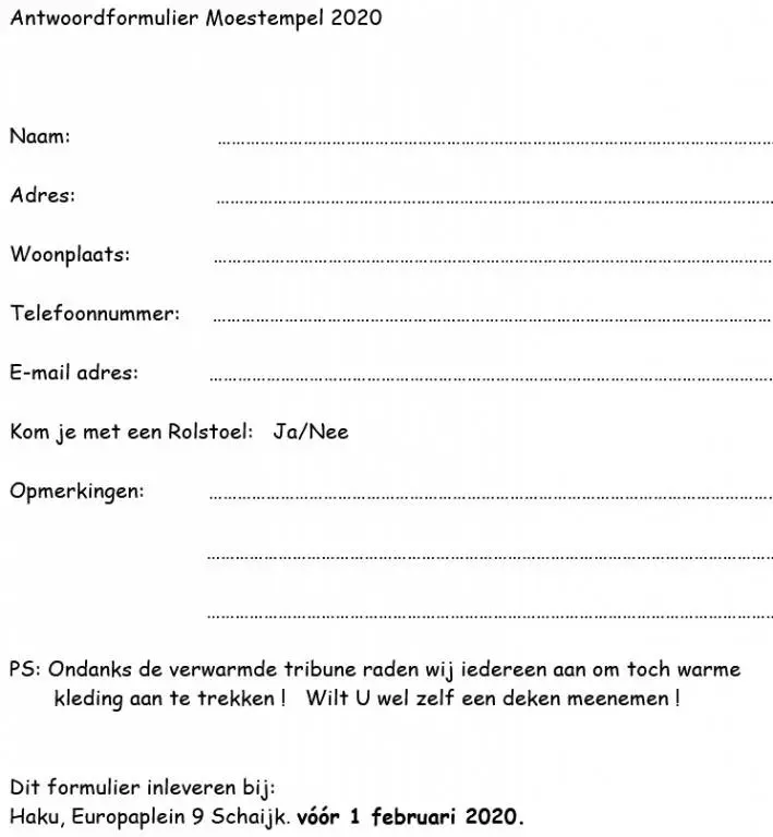 Omdat de organisatie van de Moestempel het belangrijk vindt dat iedereen uit de gemeenschap deel kan nemen aan het carnavalsfeest, mogen mensen met een beperking gratis gebruikmaken van deze faciliteiten. Alleen zij krijgen hiervoor een persoonlijke uitnodiging. Personen die in voorgaande jaren ook een uitnodiging in de brievenbus kregen om gebruik te maken van een plaats in een de Moestempel, krijgen dit jaar geen brief meer. Zij kunnen zich wel aanmelden voor deze gezellige middag door onderstaand formulier in te vullen en vóór 1 februari in te leveren bij HAKU, Europaplein 9 in Schaijk. Antwoordformulier inleveren vóór 1 februari 2020. Reageer tijdig, want er is slechts een beperkt aantal plaatsen beschikbaar. Begeleiders en andere geïnteresseerden betalen een vergoeding van 11 euro per persoon. De kaarten dienen contant te worden betaald.