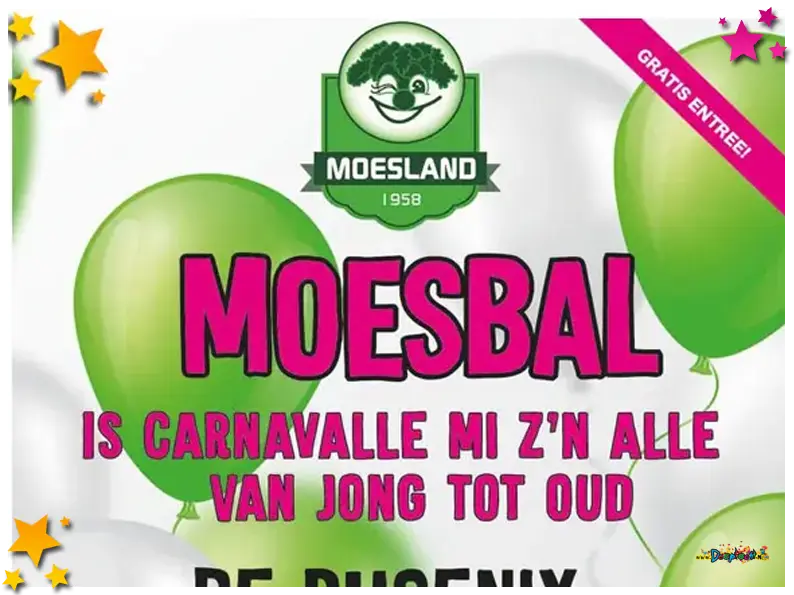 “Het Moesbal is ontstaan doordat wij last minute nog een locatie zochten voor Carnavalloverz” aldus Vivian van Dinther namens Carnavalloverz. “Nu wordt het o.a. gecombineerd met het Koenken zodat de kosten voor het licht, geluid en versiering en dat is voordelig voor de kosten”, gaat Vivian verder.