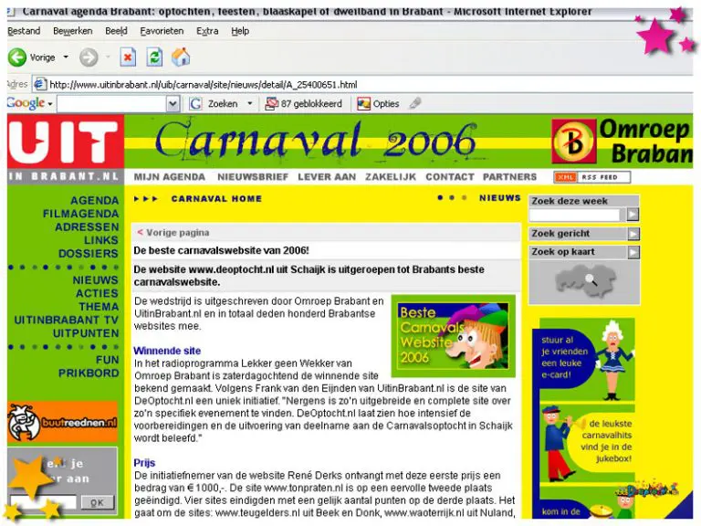 Eén van de hoogtepunten was het behalen van de titel ‘Beste carnavalswebsite’. Omroep Brabant had in 2006 een wedstrijd uitgeschreven om de beste carnavalswebsite te vinden. Ik ben niet zo van de wedstrijdjes maar op aanraden van Grootvorst Leonard Steetsel en Willemien van den Brand toch de website aangemeld. En met succes! Enorm trots met het behalen van de eerste plaats, een kroon op het werk en een bewijs dat ik op de goede weg zat.