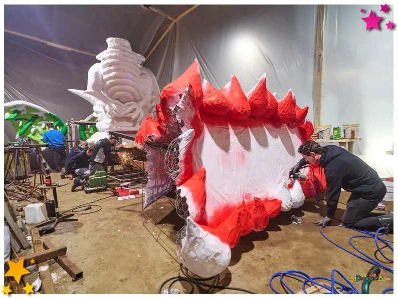 Er staan opvallend veel auto’s voor zo’n ogenschijnlijk verlaten bedrijventerrein, en in de verte klinkt bedompt gedreun, dat opeens keihard en helder door de regen schalt als in een van die hallen een kleine groene deur met beslagen glas open gaat. Daarbinnen een oase van licht en kleur, van bier en bouwers, van lasmaskers, rollen gaas. Híer is het carnaval.