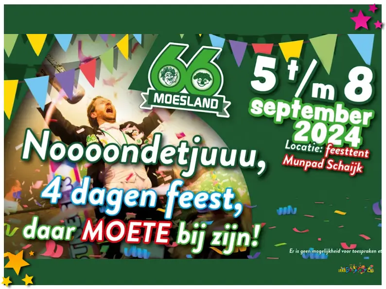 De aftrap van het 66 jarig jubileumfeest is op donderdag 5 september om 19.00 uur. Zoals bij elk lustrum is er nu ook een tentoonstelling met unieke objecten uit 66 jaar Moesland’s carnaval. Vanaf 20.00 uur wordt de nieuwe documentaire over 66 jaar Moesland getoond. Met de titel “Wà hebbe we toch gelaache: 66 joar same schik in ut Moesland” wordt er een mooi beeld gegeven van 66 jaar lang plezier met carnaval in Schaijk.