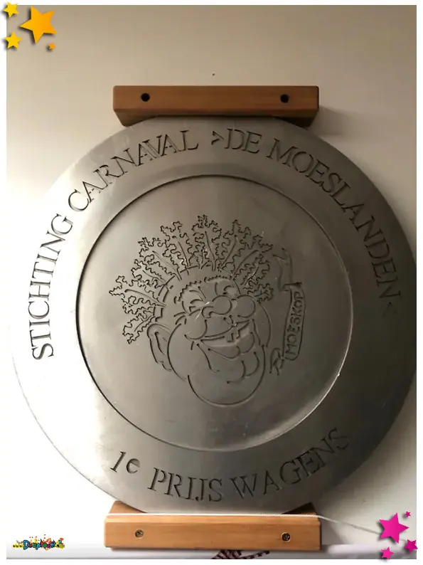 Dit is ie, wijst Van de Schans op de grote trofee die in de bestuurskamer aan de muur hangt: een metalen schaal van zeker 25 kilo. ,,Daar wil heel Schaijk zijn naam op hebben staan”, weet hij uit ervaring. Om die reden hoopt hij dat de gemeente Maashorst het carnaval in Schaijk blijft steunen. Nu al moeten er bouwers uitwijken naar buurdorpen als Velp en Berghem. Een nieuwe, grote bouwhal naast het Frotkot zou veel helpen. ,,Want we willen na 66 jaar Moesland ook graag de 77, 88 en 99 jaar vieren. En verder”, zegt hij lachend.