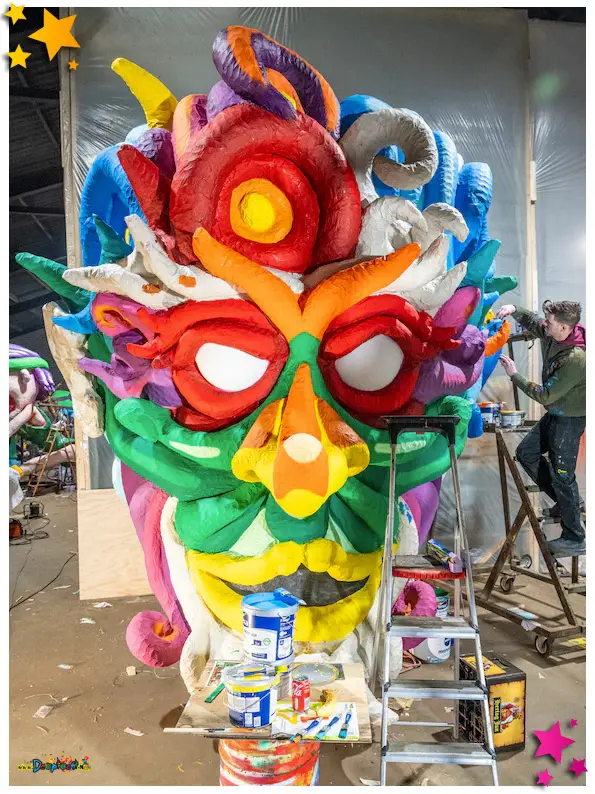In de hal naast het Frotkot, op de oude gemeentewerf, is dat goed te zien. In die afgeschreven loods hebben vijf clubjes onderdak gevonden en wordt er ook hard gewerkt: lassen, kippengaas erover, papier erop plakken en dan schilderen. Er moet nog heel veel gebeuren maar de kleuren spatten er nu al vanaf. ,,Het schiet redelijk op”, zegt Rob Reijnen over de ‘droomwagen’ van zijn club Ut Nauwt Nie. Gebaseerd op het idee van fantasiefiguren die je ziet als je naar de wolken kijkt.