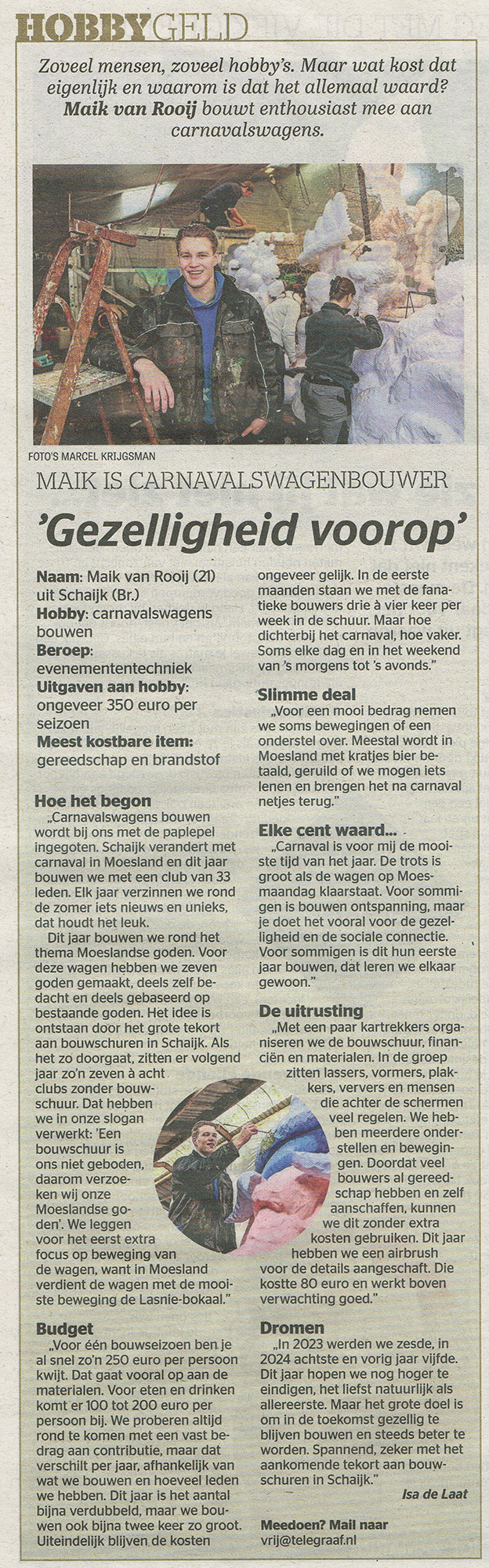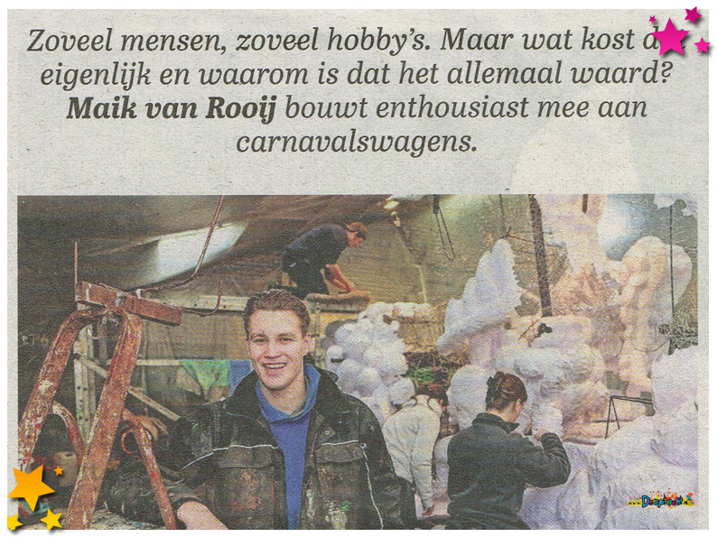 Maik van Rooij, van carnavalsvereniging Hartstikke Gek, staat vandaag in de Telegraaf. Hij praat uitgebreid over zijn hobby: het bouwen van carnavalswagens. De Telegraaf is benieuwd naar wat dat eigenlijk allemaal kost. Maik heeft het heel mooi verwoord, het hele stuk kun je hieronder lezen.