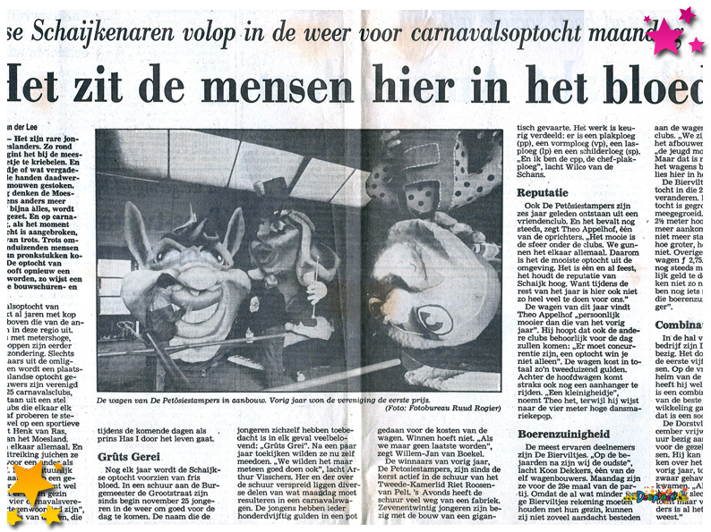 Het Brabants Dagblad schreef in de jaren ’80 al: ‘Het zit de mensen hier in het bloed.’ En dat is nog steeds zo. Wie het krantenarchief induikt, ziet koppen als: ‘Optocht Moesland weer de mooiste’, ‘Optocht Schaijk bevestigt reputatie’ en ‘Feestelijk besmet met het Moeslandvirus’.