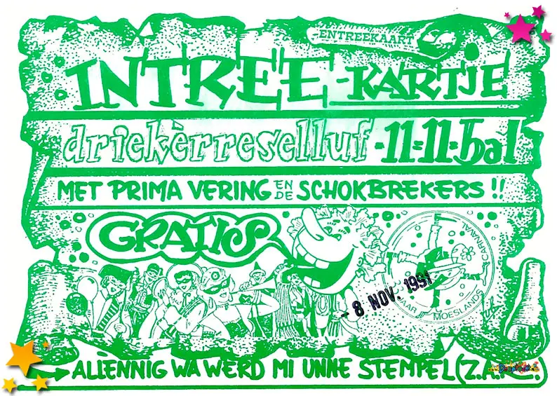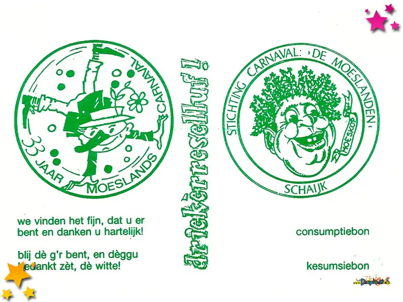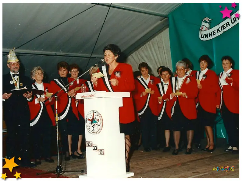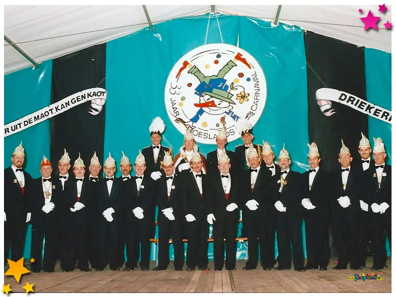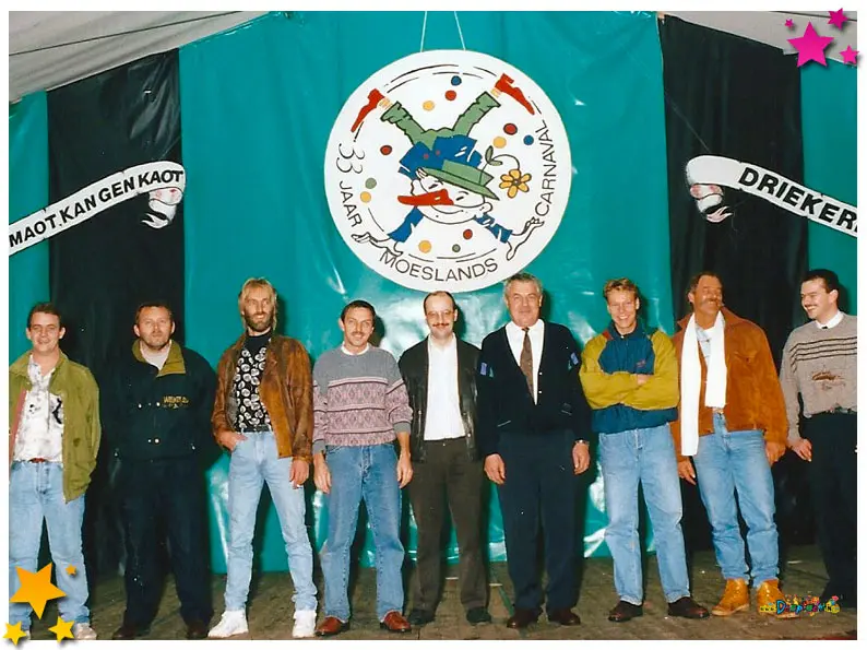 33 jaar carnaval Schaijk: In het weekend van 8, 9 en 10 november 1991 vierde Schaijk een mijlpaal waar menig carnavalsliefhebber warm van werd: 33 jaar Moeslands carnaval. Een bijzondere gelegenheid die natuurlijk niet zomaar voorbij kon gaan. Daarom werd het hart van het Moesland, het Europaplein, omgetoverd tot hét feestcentrum van het dorp, compleet met een gigantische feesttent waar drie dagen lang werd gelachen, gezongen, gedanst en geproost.