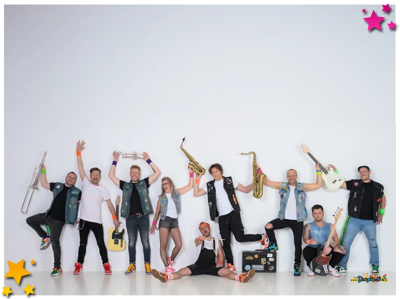 Staal met Glazen gooit de boel compleet op z’n kop! Acht vrienden en één vriendin die samen garant staan voor chaos, gezelligheid en dampende dansvloeren. Met een lichtelijk gestoorde frontman die over het podium stuitert alsof z’n leven ervan afhangt, een snarenclub die vonken trekt, vier blazers die niet stil kunnen staan en een ritmesectie die je schoenen van de vloer blaast.