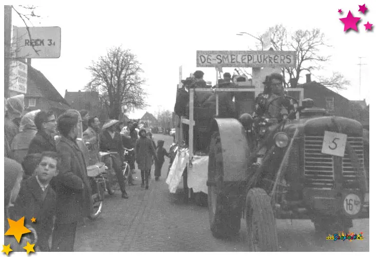 De optocht van 1963 stond vooral in het teken van het weer. Het was een koude en natte dag, maar dat hield deelnemers en publiek niet tegen. Een bekende foto toont de Raad van Elf op de hoek waar nu rechts de Jumbo staat en links eethuis Van Son (tegenwoordig het Friethuys). Destijds lag daar nog een bouwterrein; pas later werd dat deel van het dorp ontwikkeld en kreeg de route de draai die we vandaag kennen.