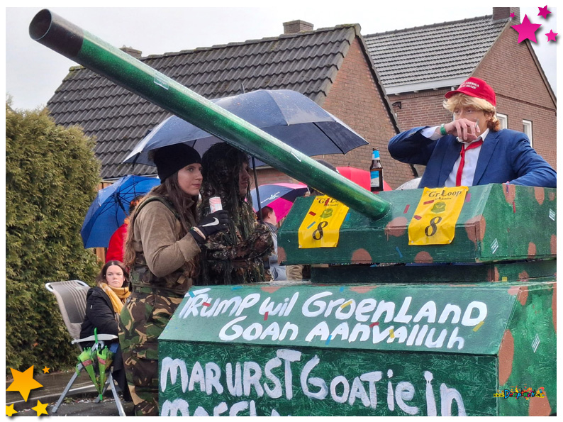 Maar liefst 17 wagens, 9 grote loopgroepen, 19 kleine loopgroepen en 11 individuelen trokken door de straten. Ondanks de dreigende schaarste aan bouwschuren, een probleem dat de toekomst van de optocht serieus kan raken, presenteerden de wagenbouwers opnieuw indrukwekkende creaties. Nieuwkomer cv We Goan Er Tegen Oan maakte meteen indruk met een grote wagen. Zeker voor een eerste deelname op jonge leeftijd verdient dat alleen maar respect, wat ook duidelijk zichtbaar was bij het ontvangen van de Groene Kwast.