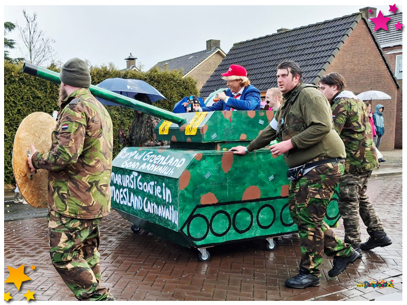 De Inburgerkings deden mee met een gekochte wagen, iets waar normaal kritisch naar wordt gekeken. In dit geval werd het echter gewaardeerd vanwege de duidelijke boodschap richting de gemeente Maashorst: “Zonder bouwschuren moet je naar dit soort wagens turen.” Dat burgemeester Hans van der Plas zelf meedeed op de wagen maakte het statement extra krachtig, meedoen is immers de beste manier om te ervaren wat de optocht betekent.
