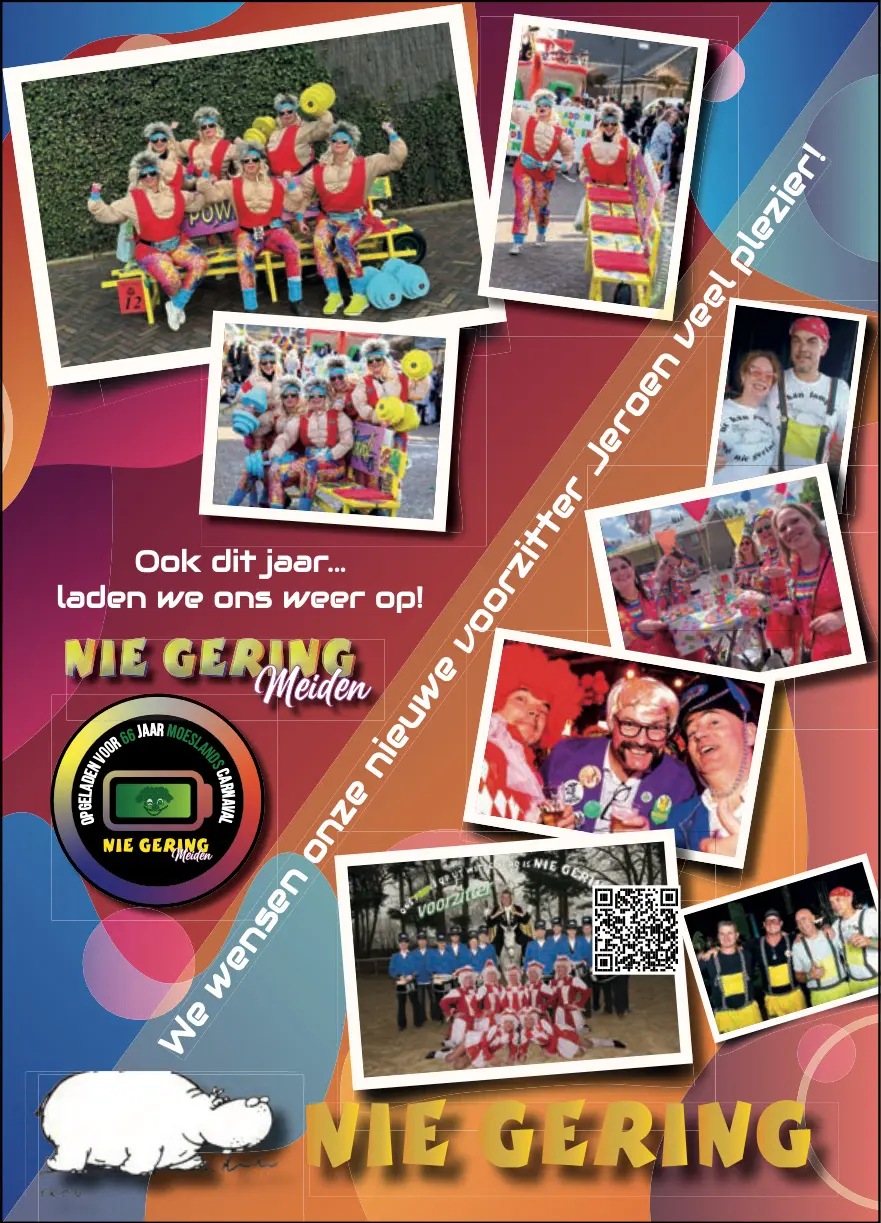 Tijdens de optocht van 2008 pakken de Meiden van Nie Gering een derde plaats bij de kleine loopgroepen met het idee: “De Moeszakkinnekes van Nie Gering zen op zoek noar d’n enige echte Moeskoning”. Dus naast de heren, zijn nu ook de meiden vertegenwoordigd op de medaillespiegel van de kleine loopgroepen.