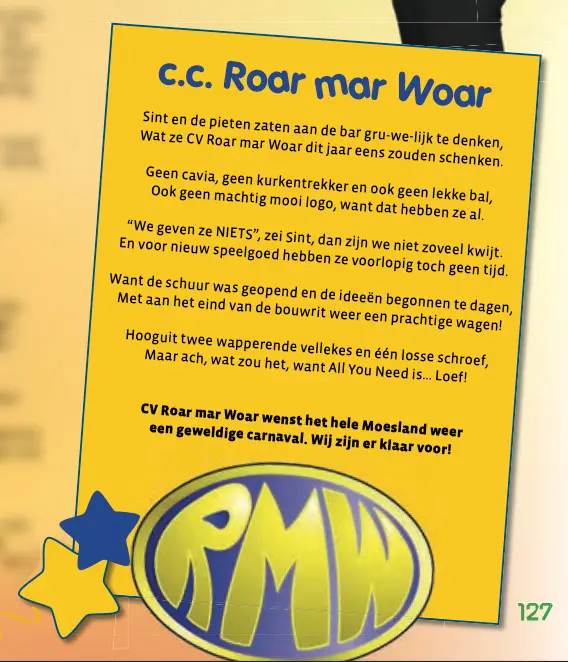 Het laatste wapenfeit voor Roar Mar Woar was in 2013. Daarna bleef het stil tijdens de optocht. Maar niet in de carnavalskrant. Deze werd ieder jaar trouw opgevuld met een verhaal over het wel en wee van Roar Mar Woar.