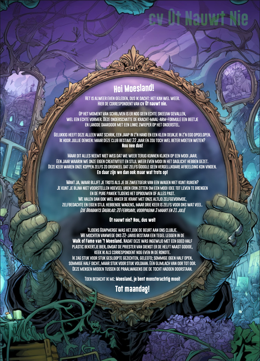 2026 kwam Ut Nauwt Nie regelmatig in het nieuws, nou ja de foto van de wagen van 2025 werd bij het Brabants Dagblad iedere keer gebruikt om de problematiek rondom de bouwschuren aan te kaarten. Ook Omroep Brabant heeft een bezoekjes gebracht aan Ut Nauwt Nie. In de optocht hadden ze een mooie achtste plaats met ‘Moesland Monsterachtig Mooi’.