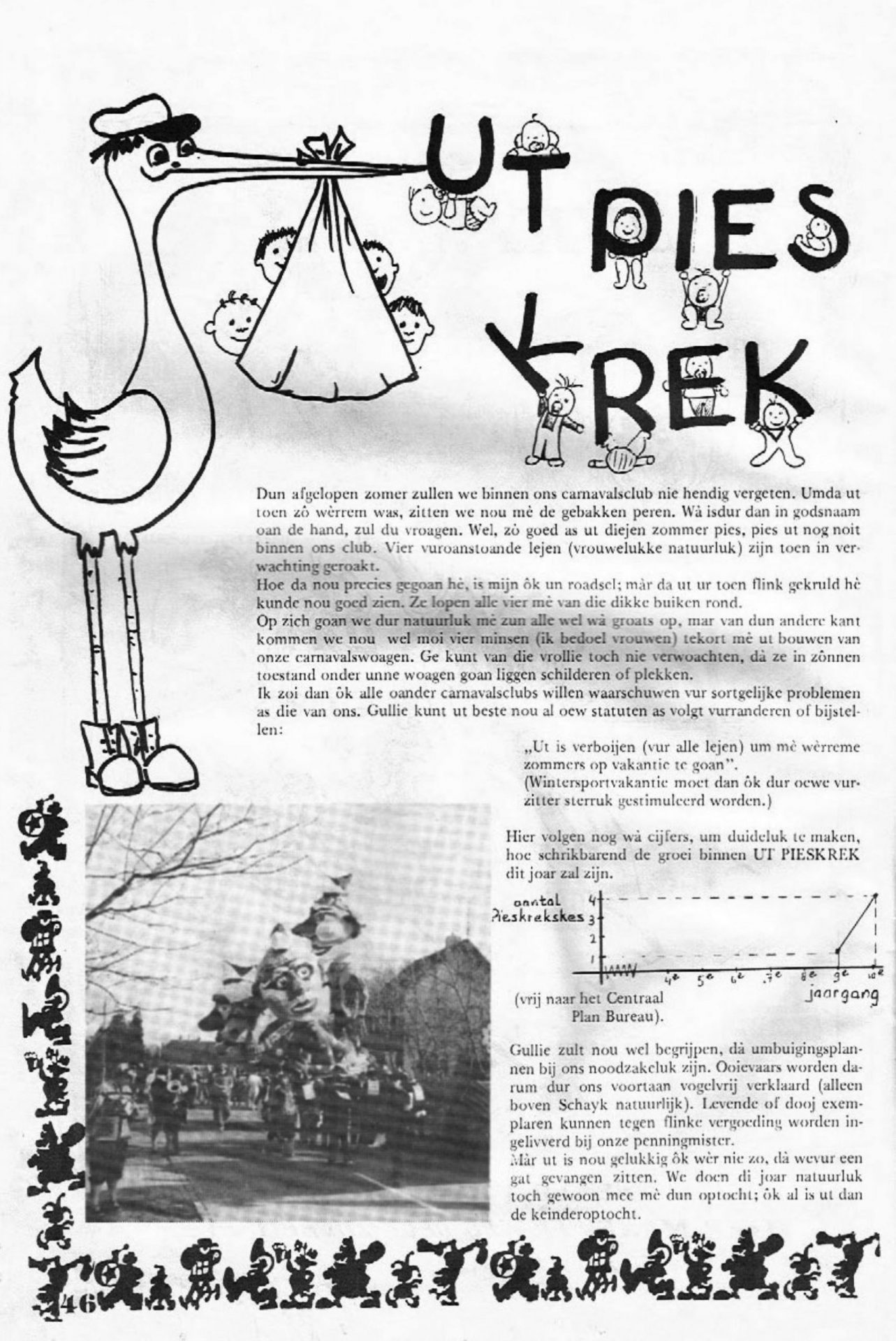 Ut Pies Krek is opgericht in 1973 en hun eerste deelname aan de optocht was in 1974. Helaas hebben we pas officieel uitslagen vanaf 1976, de uitslagen die hier uit 1974 en 1975 staan komen uit de carnavalskrant.