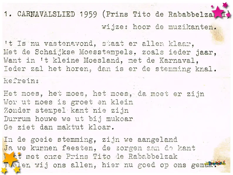 Even bijzonder is het lied van de allereerste prins: Prins Tito de Rababbelzak. Zijn naam leeft voort in het collectieve geheugen, en met dit document krijgen we een uniek inkijkje in het ontstaan van onze kleurrijke Moeslandse geschiedenis.