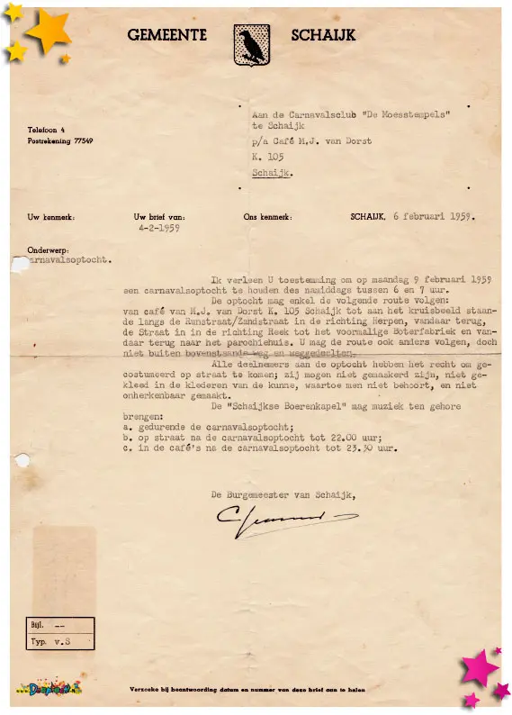 Een van de oudste en meest betekenisvolle documenten Moesland uit ons archief stamt uit 1959: de allereerste vergunning voor de optocht in Schaijk. Dit officiële papier legde de basis voor een traditie die tot op de dag van vandaag voortleeft — de Maandagse optocht, hét hoogtepunt van carnaval in het Moesland.