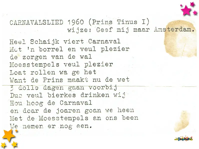 In de vroege jaren van het Moeslands carnaval was het gebruikelijk om zelf liedjes te schrijven op bestaande melodieën. In 1960 werd er een carnavalslied gezongen op de wijze van het bekende nummer “Geef mij maar Amsterdam”. De melodie bracht meteen sfeer, maar de tekst was helemaal Moeslands eigen makelij.