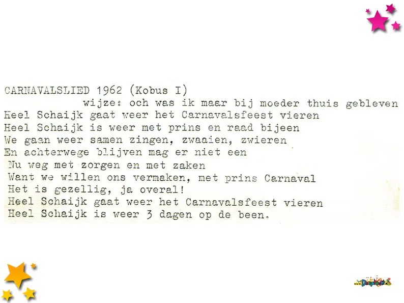 In de beginjaren van het Moeslands carnaval was het gewoon om ‘eigen’ liedjes te maken. Vaak werd er een lied geschreven op een bestaande melodie. Zo ook in 1962, dit lied is op de wijze van “Och was ik maar bij moeder thuisgebleven”. Het origineel kun je hier terug luisteren.