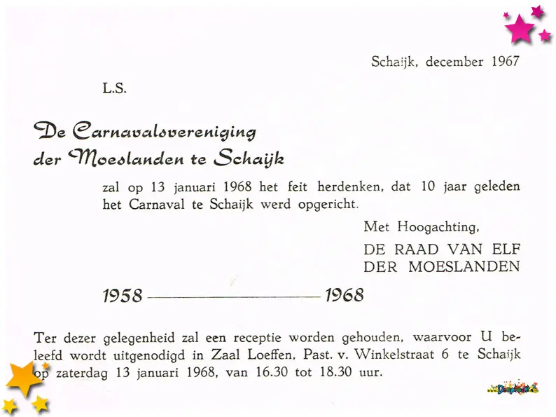 In 1967 ontvingen genodigden een officiële uitnodiging voor een feest dat een mijlpaal markeerde: in 1968 zou het 10-jarig bestaan van De Carnavalsvereniging der Moeslanden worden gevierd. De uitnodiging kondigde niet alleen het aanstaande jubileum aan, maar weerspiegelde ook de trots en het besef van wat er in tien jaar tijd was opgebouwd.