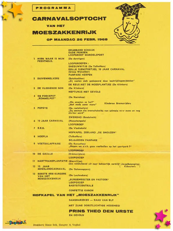 In 1968 vierde het Moesland niet alleen het tienjarig bestaan van de Carnavalsvereniging, maar ook een van de hoogtepunten van het feest: de carnavalsoptocht van het Moeszakkenrijk. Het volledige programma van deze optocht is bewaard gebleven en vormt een prachtig tijdsdocument.