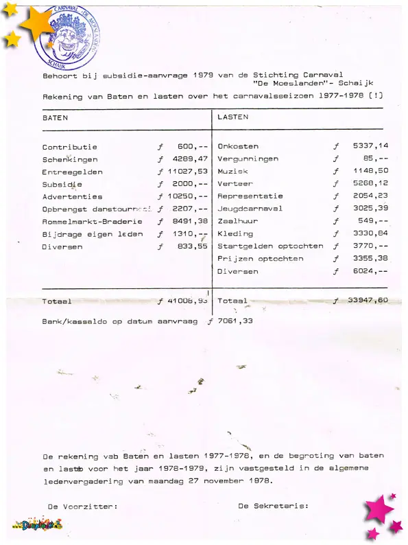 Als je subsidie wilt aanvragen, dan hoor je transparant te zijn. Zeker voor wat de financiën betreft. Dit is het ‘baten- lastenlijstje’ van 1978.