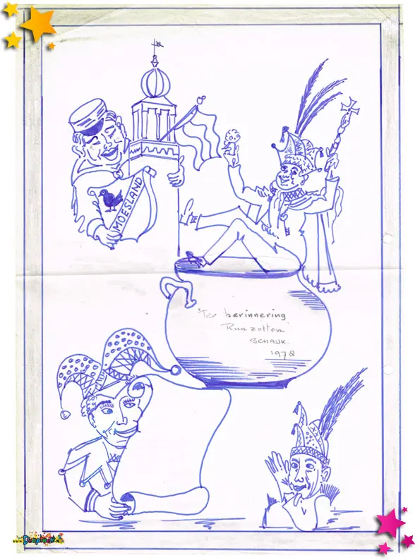 Carnavalsvereniging de Runzotten maakte ook in 1978 een bouwtekening/ontwerp van hun carnavalswagen. Het idee was “Alles wat u hier ziet, dat gebeurt er op de Brink zeker niet!”