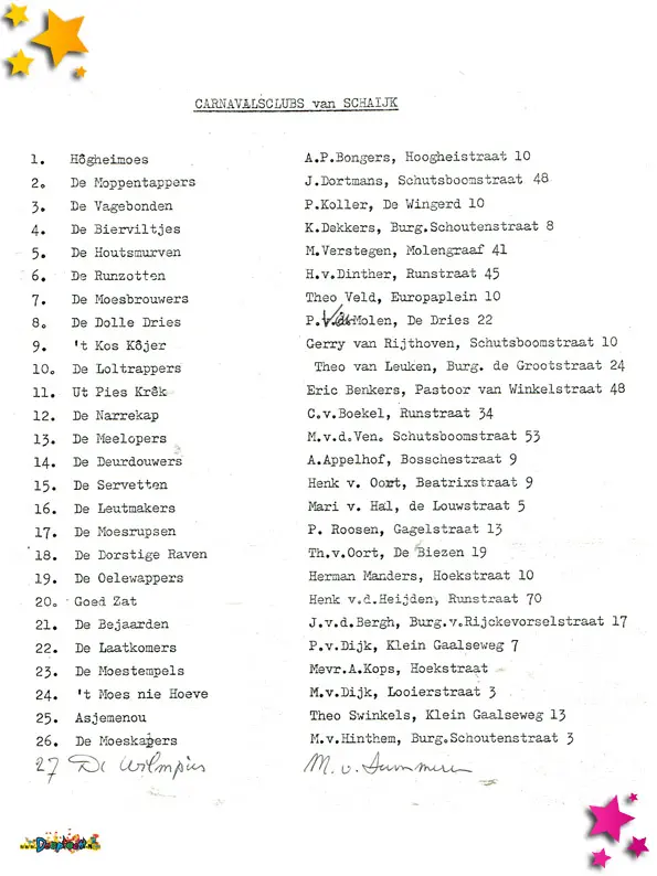 Een overzicht van de actuele lijst van carnavalsclubs in Schaijk uit 1978.