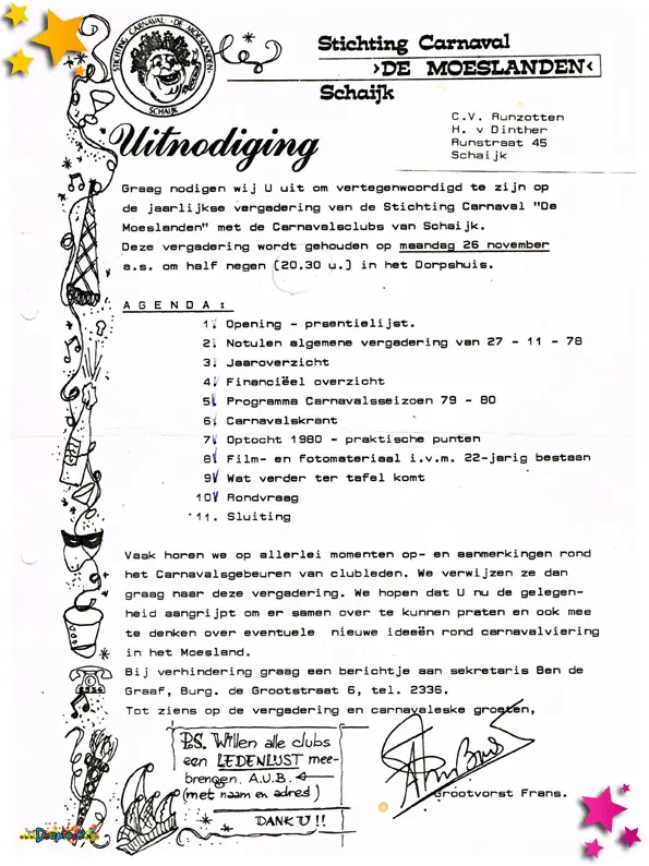 Uitnodiging van Stichting Carnaval de Moeslanden voor een vergadering met clubs. We komen al dichterbij een clubvergadering.