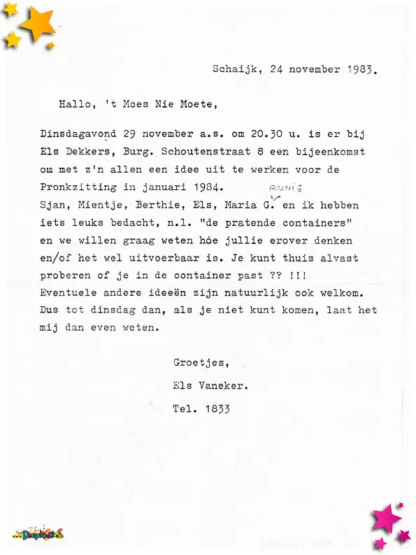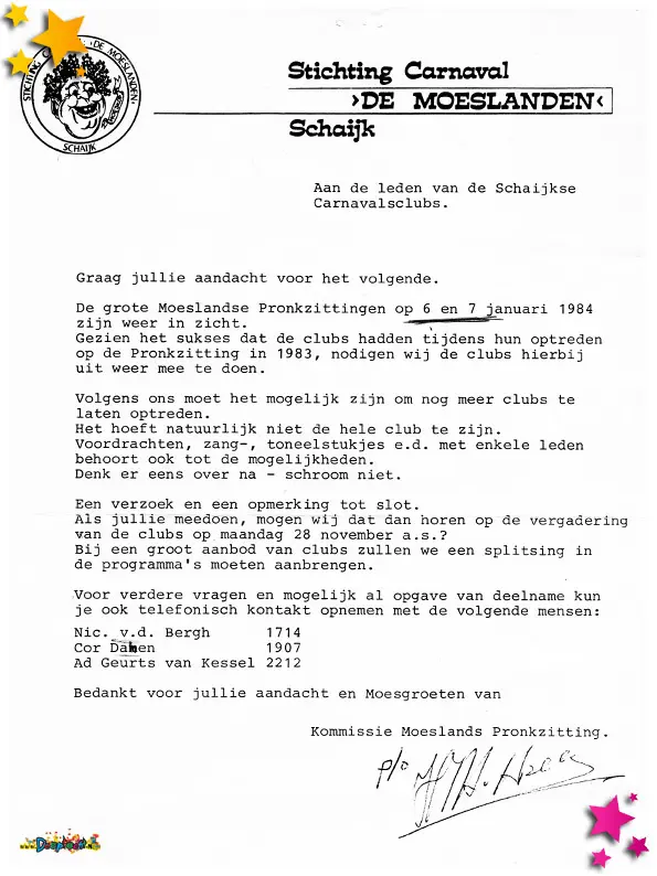 Zonder artiesten geen pronkzitting. Voor de pronkzitting van 1984 werden er in 1983 brieven verstuurd naar de carnavalslclubs om vooral maar deel te nemen aan de pronkzittingen.