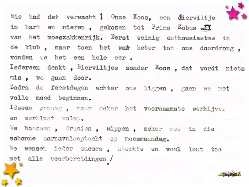 Carnavalsvereniging ’t Kos Kojer deed mee aan de pronkzitting van 1983. Hieronder het complete stuk.