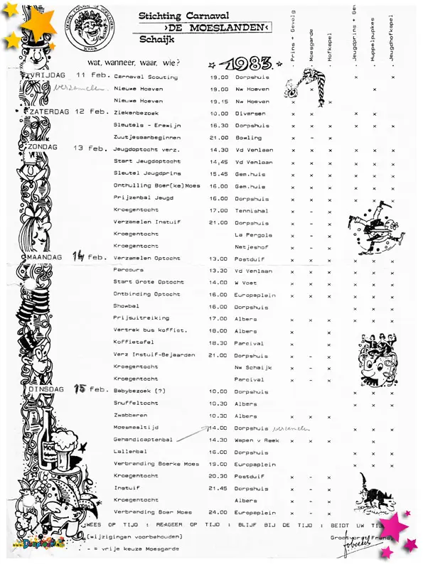 Iets wat nu nog wordt gebruikt door Stichting Carnaval de Moeslanden en Jeugdcarnaval Schaijk. Het invullen van het kruisjesprogramma geeft een goed beeld wie er bij welke activiteiten aanwezig is.