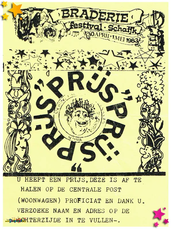 Tijdens de braderie kon je vele prijzen winnen. Als je wat gewonnen had dan had je dit soort kaartjes en die kon je inleveren bij het centrale punt tegenover de ‘driehoek’.