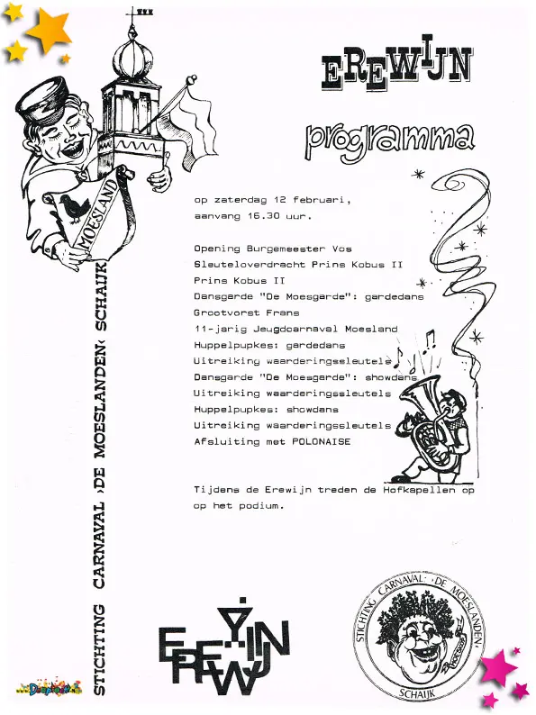 Een bijzonder document is het programma van de Erewijn – een officiële samenkomst waarbij de burgemeester symbolisch de sleutel van het dorp overdraagt aan de carnavalsvierders. Deze ceremonie vond plaats met vertegenwoordigers van zowel het Moesland als de Kelestropers (Reek), en stond symbool voor de tijdelijke machtsoverdracht.