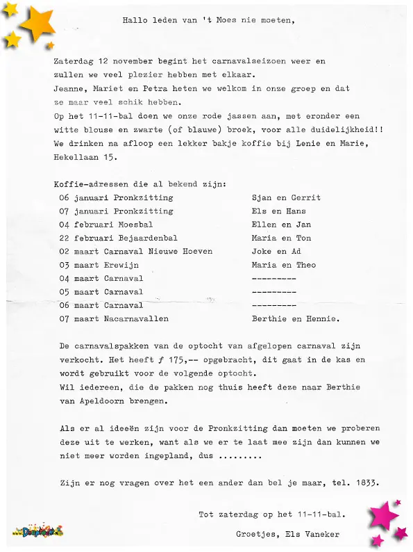 Uitnodiging voor een vergadering van de leden van carnavalsvereniging Moes Nie Moete.