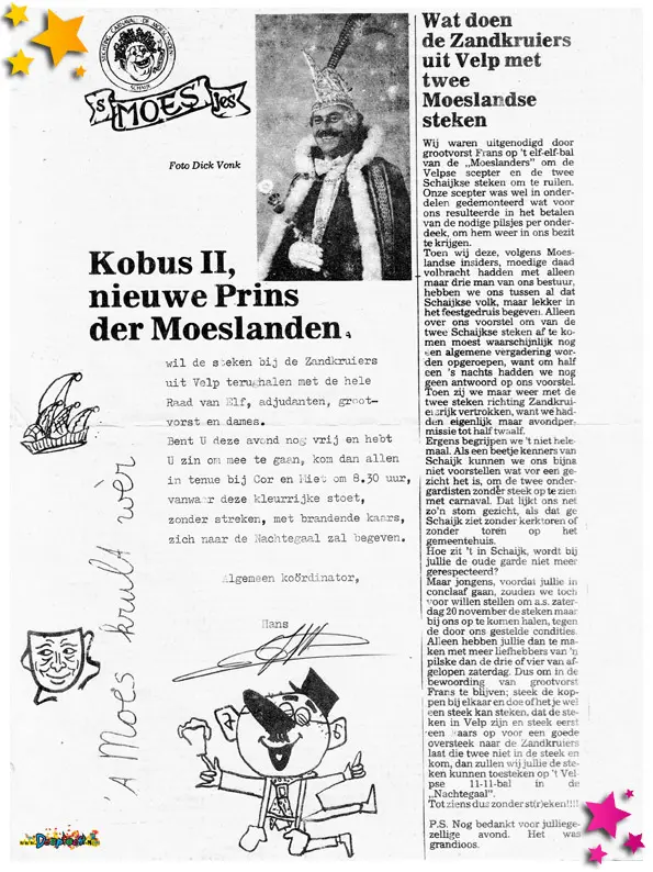 Prins Kobus II (Koos Dekkers) kreeg van de Smoesjesmaker een kaartje om hem te feliciteren met zijn benoeming tot Prins der Moeslanden.