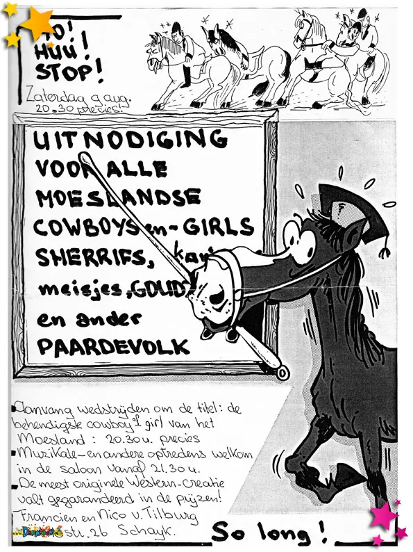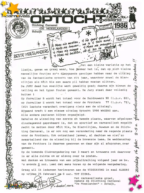1986 was een jaar waarin het Moesland nieuwe ideeën durfde te omarmen en met speelse symboliek experimenteerde. In het archief zijn een aantal opvallende documenten en objecten terug te vinden die samen een beeld geven van een jaar vol creatief “probeersel” — zoals de Moeslanders het zelf zo mooi noemen.