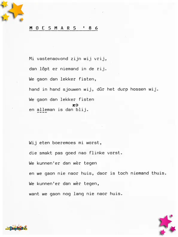 De Moesmars, een lied voor het Moesland. Mij is niet bekend waar dit is voor gebruikt.