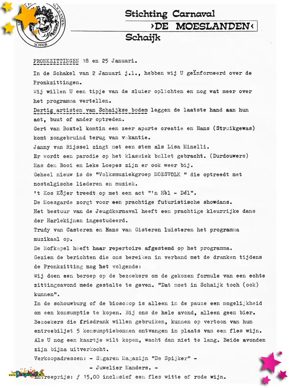 Een persberichtje van Stichting Carnaval de Moeslanden om de pronkzittingen aan te prijzen.