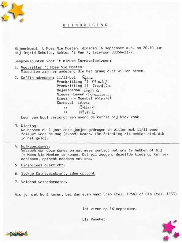 Uitnodiging en agenda voor vergadering carnavalsvereniging ’t Moes Nie Moete.