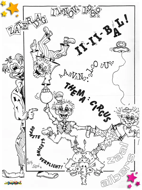 Uitnodiging voor het 11-11-bal van 1989. Bijzonder aan deze uitnodiging is, is dat deze gemaakt is door Jurgen Wilbers van Gedûrig Wispeltûrig en Nicole Schellekens van Lochte Klocht. Tijdens de clubvergadering werd besloten dat de organisatie van het 11-11-bal door de clubs gedaan zou worden. Gedûrig Wispeltûrig, Grûts Grei en Lochte Klocht namen dit op zich. Circus Gedurig Locht Grei was geboren.