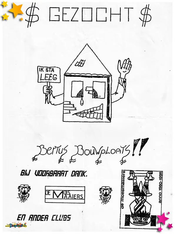 De Moesmaaiers (tegenwoordig Klore Kwats), had in de optocht van 1989 het idee “Gen plots um te bouwe, nie mauwe, gewoen carnaval houwe”. Met dit idee pakte ze de vierde plaats bij de grote loopgroepen. Het was meer een oproep om bouwplaatsen beschikbaar te stellen voor de vele carnavalsclubs, dus niet alleen voor de Moesmaaiers. Want zonder bouwplaats…geen wagens.