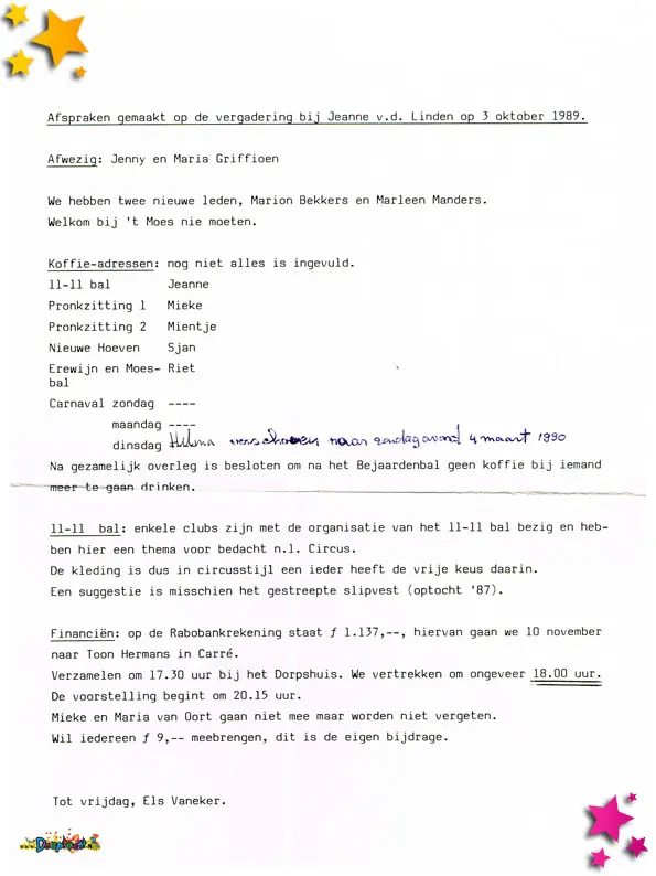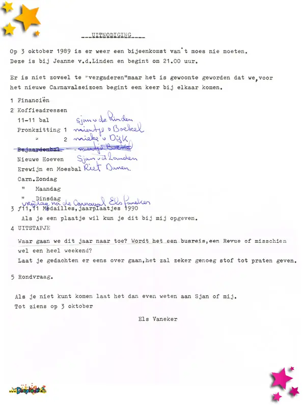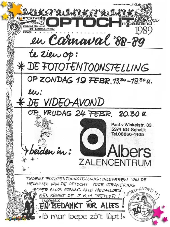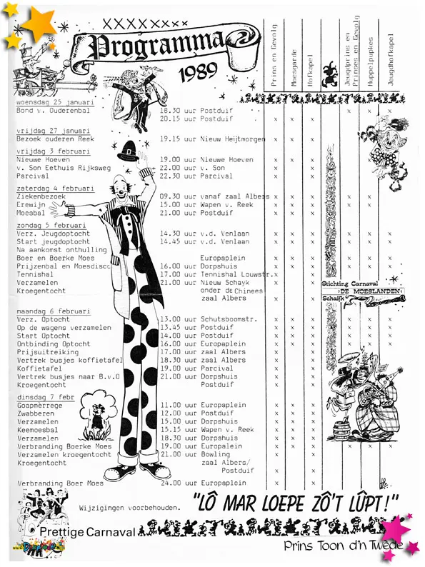 1989 was een jaar waarin het Moeslandse carnaval nieuwe samenwerkingen zag ontstaan, originele ideeën tot leven kwamen, en vrijwilligers opnieuw in het zonnetje werden gezet. De documenten uit dit jaar laten een gemeenschap zien die bruist van creativiteit én waardering.