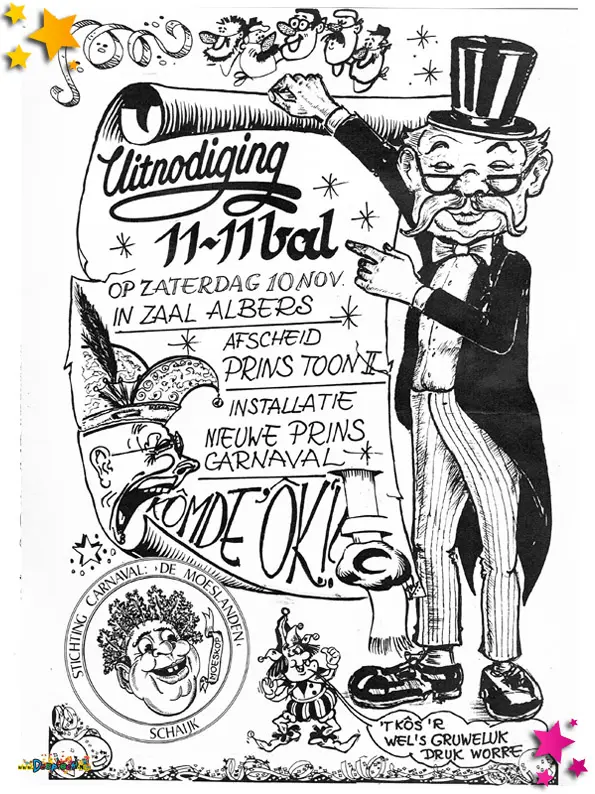 De uitnodiging van het 11-11-bal. Het 11-11-bal werd dit jaar weer georganiseerd door Stichting Carnaval de Moeslanden.
