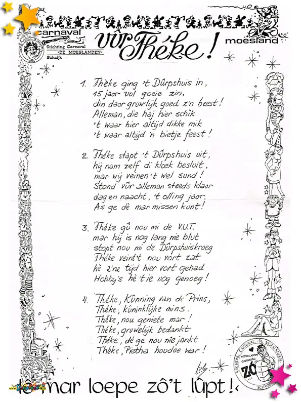 Op de koffietafel bij Parcival en na afloop van carnaval 1990 zijn bijgaande teksten gebruikt. Deze heeft Frans van Boekel verzameld en in één documentje gezet.