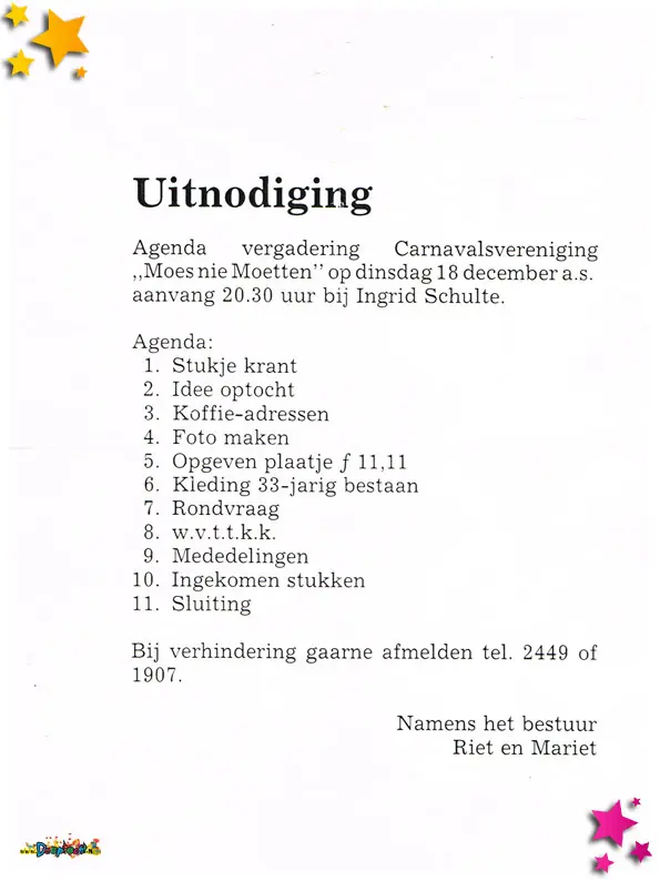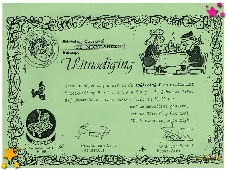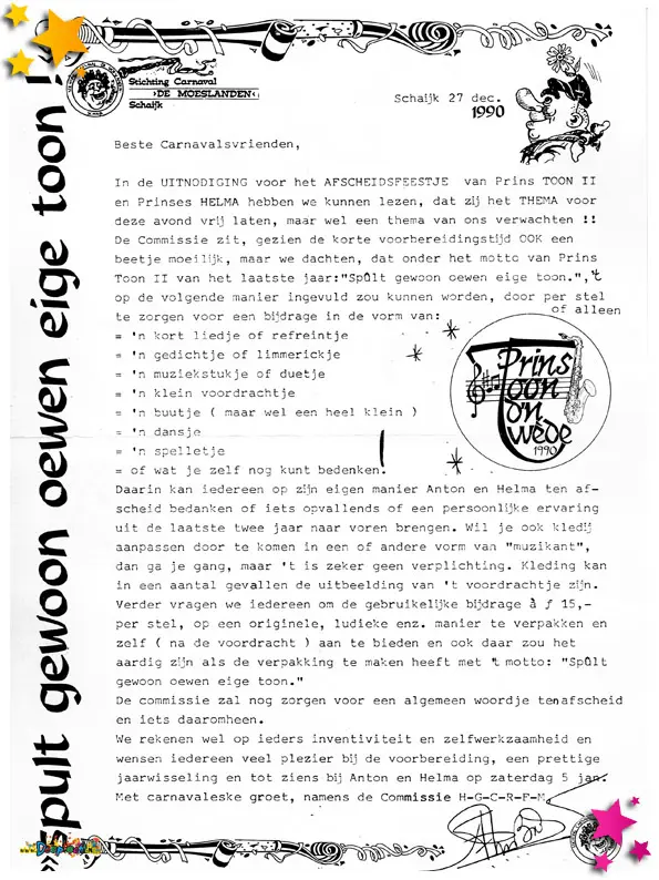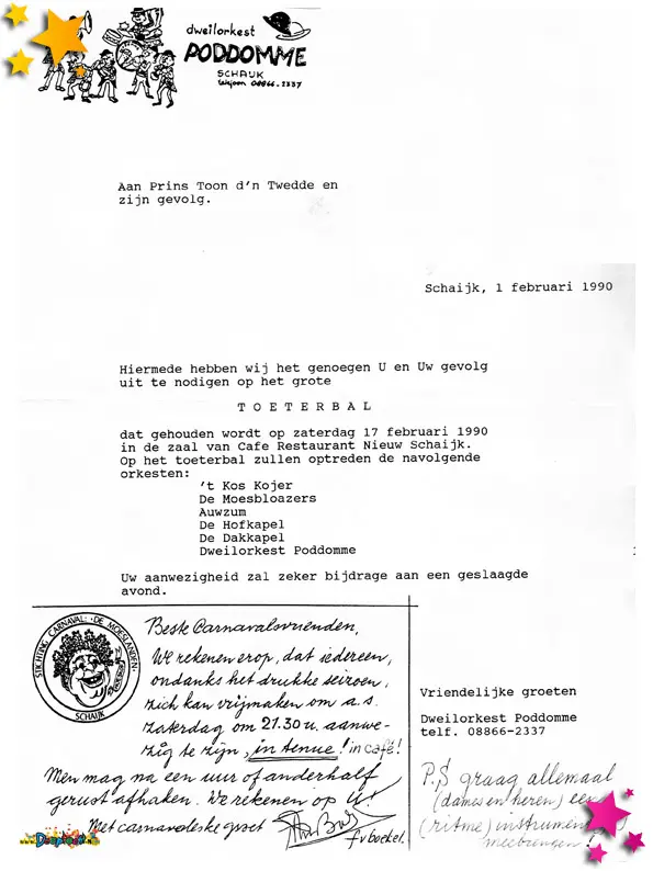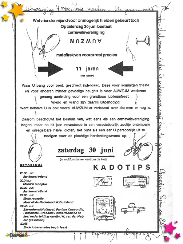 Carnavalsvereniging Auwzum bestond in 1990 11 jaar en dat moet gevierd worden. Voor dat feestje werden deze uitnodigingen verstuurd.